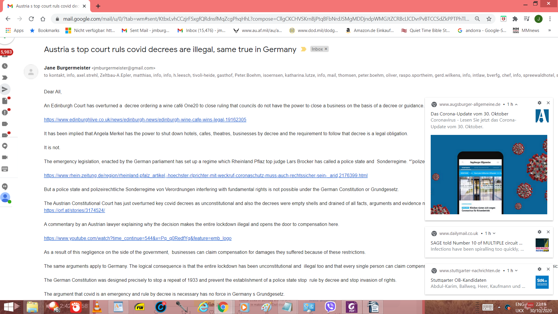 jesuitsdidit Posted November 17, 2020 Share Posted November 17, 2020 http://thefourthempire.blogspot.com/2020/10/my-email-urging-german-businesses.html?m=1 BIRDFLU666 WORDPRESS BLOG CONTINUES HERE AGAINST THE EUGENICIST GLOBALISTS, THEIR VACCINES AND DEPOPULATION PLANS October 30, 2020 MY EMAIL URGING GERMAN BUSINESSES, PEOPLE TO TAKE LEGAL ACTION, WILL SUCCEED AS IN AUSTRIA Dear All, An Edinburgh Court has overturned a decree ordering a wine café One20 to close ruling that councils do not have the power to close a business on the basis of a decree or guidance. https://www.edinburghlive.co.uk/news/edinburgh-news/edinburgh-wine-cafe-wins-legal-19162305 It has been implied that Angela Merkel has the power to shut down hotels, cafes, theatres, businesses by decree and the requirement to follow that decree is a legal obligation. It is not. The emergency legislation, enacted by the German parliament has set up a regime which Rheinland Pflaz top judge Lars Brocker has called a police state and Sonderregime. *”polizeirechtliche Sonderregime von Verordnungen”) https://www.rhein-zeitung.de/region/rheinland-pfalz_artikel,-hoechster-rlprichter-mit-weckruf-coronaschutz-muss-auch-rechtssicher-sein-_arid,2176399.html But a police state and polizeirechtliche Sonderregime von Verordnungen interfering with fundamental rights is not possible under the German Constitution or Grundgesetz. The Austrian Constitutional Court has just overturned key covid decrees as unconstitutional and also the decrees were empty shells and drained of all facts, arguments and evidence necessary to justify the infringement of basic rights. https://orf.at/stories/3174524/ A commentary by an Austrian lawyer explaining why the decision makes the entire lockdown illegal and opens the door to compensation here. https://www.youtube.com/watch?time_continue=544&v=Pq_q0RedfYg&feature=emb_logo As a result of this negligence on the side of the government, businesses can claim compensation for damages they suffered because of these restrictions. The same arguments apply to Germany. The logical consequence is that the entire lockdown has been unconstitutional and illegal too and that every single person can claim compensation in Germany too for infringements of their basic rights which have not been justified by the government. The German Constitution was designed precisely to stop a repeat of 1933 and prevent the establishment of a police state stop rule by decree and stop invasion of rights. The argument that covid is an emergency and rule by decree is necessary has no force in Germany s Grundgesetz. Ein Gutachten der Wissenschaftlichen Dienste des Deutschen Bundestages made it clear that the invasion of fundamental rights cannot be justified by a "Generalklausel wie § 28 Abs. 1 S. 1 IfSG" prompting Wolfgang Schauble to try to recall parliament. https://www.bundestag.de/dokumente/textarchiv/2020/kw43-parlamentsbeteiligung-corona-800010 Angela Merkel has ignored these warnings and proceeded with a a de facto police state and dictatorship. This argument was ruled illegal and invalid during the Nuremberg Trials of politicians, industrialists, judges, doctors and soldiers who followed the decrees of the Nazi dictatorship. https://de.wikipedia.org/wiki/N%C3%BCrnberger_Prozess_gegen_die_Hauptkriegsverbrecher Judges who helped abolish democracy and the rule of law in 1933 to allow the Nazi dictatorship to carry out massive infringements of human rights claiming an emergency and necessity to rule by decree were condemned at the Nuremberg trials in 1947 for doing just that under due process. https://de.wikipedia.org/wiki/Juristenprozess When the Bundesrepublik Deutschland was founded after WW2, it received a new Constitution and law, Grundgesetz. It is a requirement under German law, EU law and the European Convention on Human Rights that parliamentary democracy is not suspended, illegal obligations should not be placed on individuals and that their rights should not be infringed. The emergency legislation which has de facto and in practice set up a police state and rule by decree and so abolished the Constitution and rights is, therefore, a priori invalid. The legislation was a failure of the Bundestag to perform its control function. It is a grave failure of the German army chiefs especially Martin Schelleis to allow troops to be used in unconstitutional and unjustified covid operations which involve a massive infringement of rights because each German soldiers swears an oath to uphold the Constitution, parliamentary democracy, "Recht und Freiheit." The shutting of businesses, the requirement to wear masks, restrictions on movement, all the decrees, guidance and restrictions flowing from the police state authority which has been set up illegally in violation of the Grundgesetz which makes parliament the law maker, and rights are without exception illegal under the Constitution which continues to be only reference point. If shutting down shops,businesses,theaters, wearing masks are important enough to fight covid to be made compulsory, then they should be made law following the regular procedure. Lawmakers should weigh, debate, consult, scrutinize evidence, consider the necessity and proportionality of covid measures and debate how far medical considerations (and of a select view experts) should be allowed to outweigh the many other economic and social and other factors that make human life flourish in a free and open society like Germany. The political response to covid has been extreme precisely because it involves decrees and a police state, which does not see itself obliged to weigh evidence and other important economic and societal and human rights issues. Australian public health commander Michelle Giles told the Supreme Court of Victoria trial challenging the legality of the curfew that there was “not evidence” for the effectiveness of Victoria’s curfew before it was implemented. https://www.theaustralian.com.au/news/latest-new