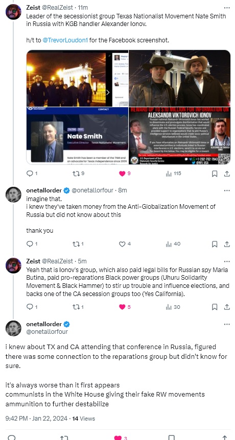 EnigmaticWorld Posted January 25, 2024 Share Posted January 25, 2024 From His Home in Russia, #Calexit Leader Plots California Secession https://www.kqed.org/news/11217187/from-his-home-in-russia-calexit-leader-plots-california-secession On Ionov's AGMR website, he refers to Nate Smith as his "Texas comrade" http://anti-global.ru/?p=17418 Quote Link to comment Share on other sites More sharing options...