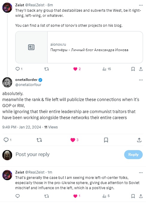 EnigmaticWorld Posted January 25, 2024 Share Posted January 25, 2024 On 1/22/2024 at 9:53 PM, EnigmaticWorld said: Zeist's images; https://twitter.com/RealZeist/status/1749546175672238349 Imagine going back to McCarthy era and telling people then that conspiracy theorists and truthers will stop caring about people subverting the West in future, and that a new Right will emerge with communist talking points. Kremlinist Marjorie Green Taylor is one of the most annoying when it comes to this active measure bs. She's constantly pushing to weaken and isolate America with balkanization, and she's another fake anti-war spook that just points at the West and NATO. https://www.justice.gov/opa/pr/russian-national-charged-conspiring-have-us-citizens-act-illegal-agents-russian-government https://www.justice.gov/opa/pr/us-citizens-and-russian-intelligence-officers-charged-conspiring-use-us-citizens-illegal Quote Link to comment Share on other sites More sharing options...
