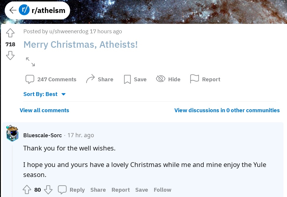 EnigmaticWorld Posted January 12, 2023 Share Posted January 12, 2023 (edited) On 12/25/2022 at 12:37 PM, EnigmaticWorld said: Surprisingly tolerant for r/atheism this time of year. Edited January 12, 2023 by EnigmaticWorld Quote Link to comment Share on other sites More sharing options...