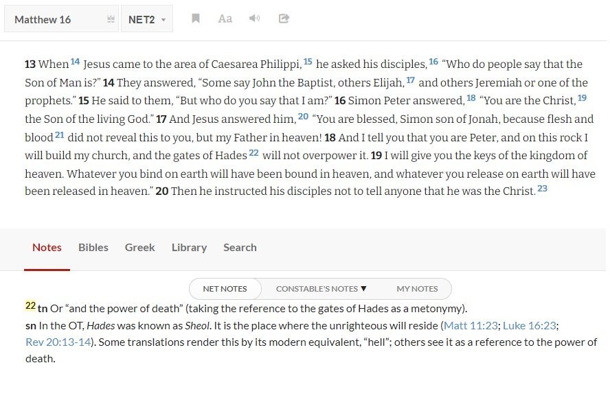 pi3141 Posted June 25, 2023 Share Posted June 25, 2023 (edited) Here's another example for you Alexa, taken from New Net Bible. Now bear in mind 100 years ago Mdm Blavatsky wrote that in the original scriptures there is no mention of the word 'Hell' instead you will find Gehenna, Sheol, Tartarus or Death. 50 years later the Anchor Bible scholars proved her correct, and now 50 years after the Anchor Bible scholars set out, a new set of scholars have done the same thing and released it for free. Here's what the other scholars to the Anchor Bible scholars say the original Bible scriptures state. (guess what, its exactly what Mdm Blavatsky wrote and the Anchor Bible scholars) The reason why I prefer the Anchor Bible can be seen above, the New Net translates the verse with 'Hades' which is an interpretation of what the original texts meant, but it correctly states in the notes that it can be interpreted as 'the power of death' which is exactly how the Anchor Bible translates it. So when I read the New Net version, I have to be mindful to check the notes to make sure it is exactly correct and not interpreted. The Anchor Bible just gives the exact translation and I do not need to check the notes to be certain of the translation and that it has not had an interpretation inserted instead. As can be seen, the text says 'Hades' is a Metonymy. metonymy noun the substitution of the name of an attribute or adjunct for that of the thing meant, for example suit for business executive, or the turf for horse racing. Edited June 25, 2023 by pi3141 Quote Link to comment Share on other sites More sharing options...