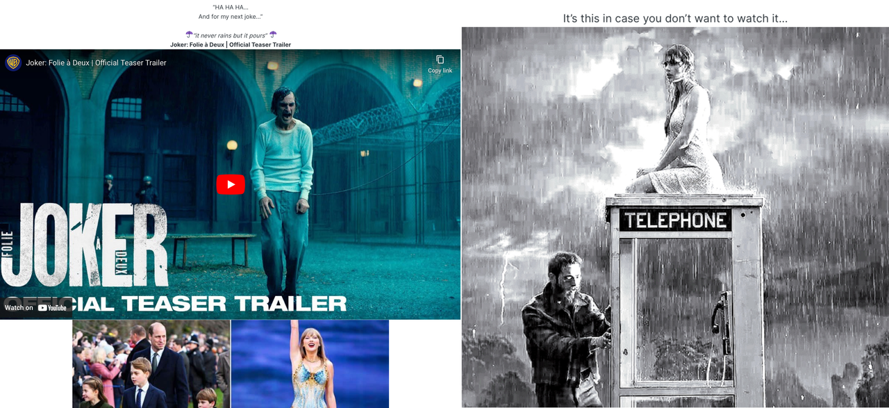 DannyUK Posted July 22, 2024 Share Posted July 22, 2024 (edited) 9 hours ago, numnuts said: Immediately after Ghislaine Maxwell got sentenced to 20 years easy labour, in June 2022, I predicted that Joe Biden would pardon her. I will update that thread in due course. I am not suggesting that the liberation of Maxwell is central to what is going on at the moment, but I think that it could be a part of it. Assuming my presumption was correct, I am wondering whether Biden might now pardon her, earlier than he would have done, if none of this had happened. Presidential pardons are usually issued in December/January, just before they leave office. However, if Biden uses the 'my health/memory is declining' excuse, then he could get round to issuing some juicy pardons early. The PTB might also see Biden's declining mental state, which is feigned to at least some degree in my opinion, as giving a bit of cover to what the vast majority would see as an inexplicable pardon. I see what you mean but don’t think/feel even they could get away with that, unless it’s deliberately to cause mass civil unrest which we know they want. But I’d image people who are politically polarised could come together on this issue and that’s not what they’d want. So if it happens people should be aware it’s deliberate to create such conflict/unrest out of it, which would be their whole intent of them doing this… The whole hunter becoming the hunted aspect even though it has been spell cast through Trump - Orion/The Fool/Joker I reckon is literally the USA the political system and economy. Which of course is represented by the Bull this may also have reference/relevance to Israel. The latest Joker trailer seems to be predicting a nightmare of torrential rain also, as does the latest Taylor Swift video from the time of Kates fake Trooping of the Colour appearance/deception of appearance by some digital means, to Prince William attending Taylor Swifts concert following such shenanigans. Something is being signalled/spell cast through this is what I am saying, part of which is mockery which is more than what it may otherwise immediately appear. Quote Lady GaGa’s involvement is here as is the case with Julia Assange and COVID - Games are being played… These are tools of delivery… Joker: Folie à Deux | Official Teaser Trailer Taylor Swift - Fortnight (feat. Post Malone) (Official Music Video) It’s time the USA the hunter/the world police the Eagle which represents the warrior spirit of man becomes the hunted… This being what the death cult are signalling and they’ve played it out through Trump and this phoney assassination. It’s symbolic for something else. This is also what is being framed through Julian Assange and the Trust Fall - Trust/Banks/Economy - Fall/Collapse that “will see the eagle be replaced with a dove ” which is the UN and Global Government out of the fall of the USA aka “The Fall of the Titans” This is what I reckon is being depicted, or something along these lines anyhow… This is desired out of such unrest, a transition and they’re basically making a fool, laughingstock out of US Politics to do this. Some of us have known and seen this for sometime, yet this is happening in your face and deliberate now to achieve this in the sense of Global Death Cult Agendas… Edited July 22, 2024 by DannyUK 1 Quote Link to comment Share on other sites More sharing options...
