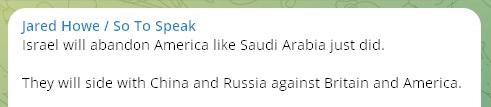 EnigmaticWorld Posted March 10, 2024 Share Posted March 10, 2024 On 5/30/2023 at 12:44 AM, EnigmaticWorld said: Dennis Prager: If US abandons Israel, ‘that is end of America’ https://www.jpost.com/diaspora/article-744356 Sounds a bit like a threat. On 6/26/2023 at 4:08 PM, EnigmaticWorld said: I expect more of this as the powers that be create a pretext to dump the West and pivot towards Eurasia. On 11/13/2023 at 9:29 PM, EnigmaticWorld said: "Netanyahu is gradually setting the stage for a political showdown with the United States." Netanyahu Sets Israel on Collision Course With Biden Over Gaza War https://www.haaretz.com/israel-news/2023-11-13/ty-article/.premium/netanyahu-sets-israel-on-collision-course-with-biden-over-gaza-war/0000018b-c800-df10-adeb-deb6f5aa0000 https://archive.is/giU21 On 4/7/2023 at 8:20 AM, EnigmaticWorld said: https://t.me/realjaredhowe Yep, Britain and the US will get crushed if the red stranglehold isn't sorted out. Netanyahu vows to defy Biden’s ‘red line’ and invade Rafah https://www.politico.eu/article/israels-netanyahu-says-he-will-defy-bidens-red-line-and-invade-rafah/ 1 Quote Link to comment Share on other sites More sharing options...
